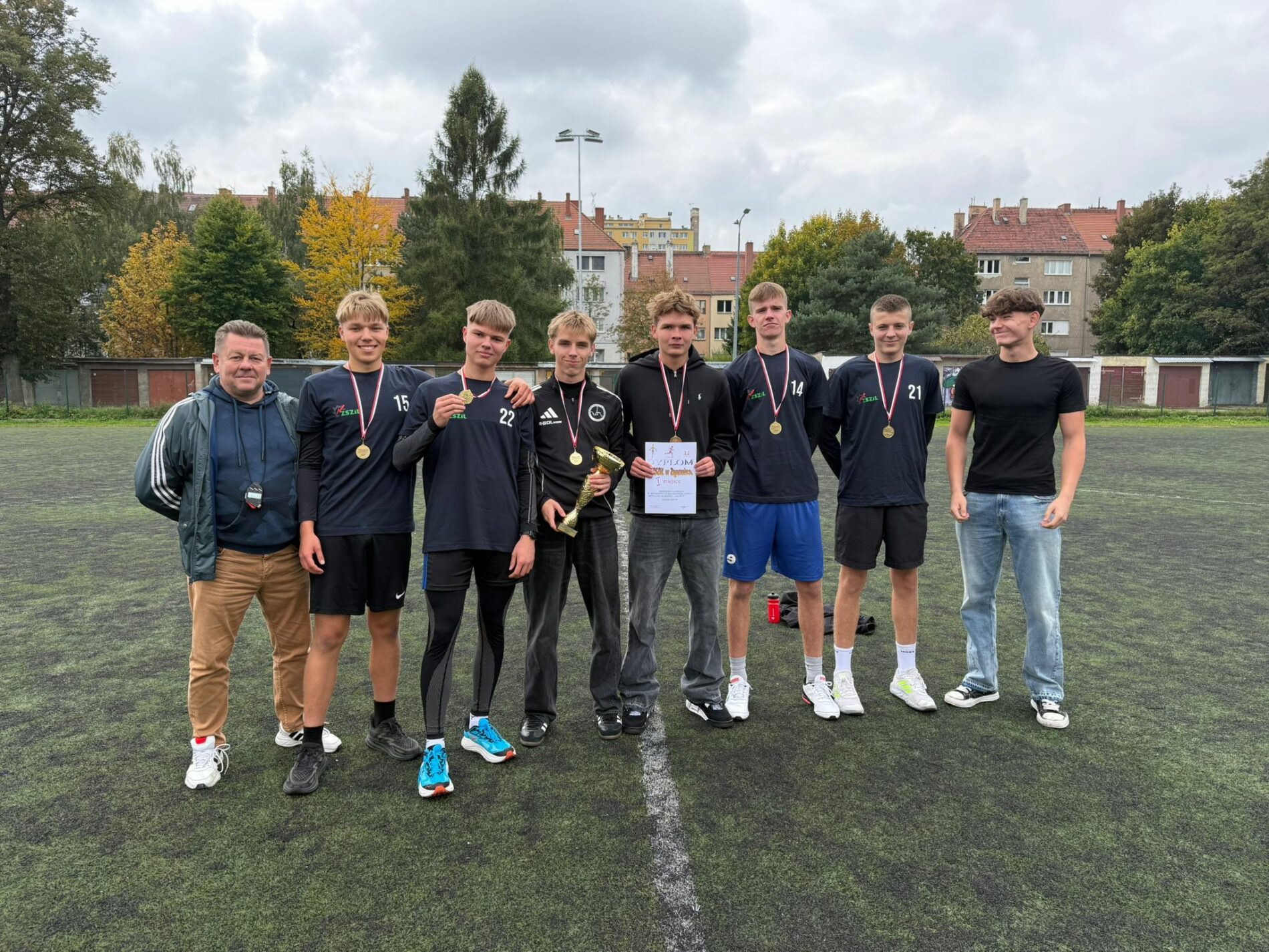 1 października na stadionie w Zgorzelcu odbyły się Finały Powiatowe w Sztafetowych Biegach Przełajowych w ramach Licealiady. Szkoły ponadpodstawowe startowały: dziewczęta na dystansach 6 x 1000m, a chłopcy na dystansach 6 x 1500m. Trasy jak na przełaje przypada, nie należały do najłatwiejszych. Wiodły po szutrze, trawie i twardej nawierzchni urozmaicone podbiegami i zbiegami. Nasze dziewczęta pomimo w dużej mierze rezerwowego składu wypadły znakomicie. No cóż, choroba nie wybiera mimo to Nasze „ślicznotki” pokazały pazur. Zajęły trzecie miejsce wśród szkół z całego Powiatu Zgorzeleckiego, gdzie na mecie tylko nieznacznie zostały wyprzedzone przez drugi zespół ze Szkoły – Cogito. Natomiast sztafeta chłopców z „Górnika” kolejny raz okazała się najlepszą. Wygrała zdecydowanie z ponad półkilometrową przewagą nad drugimi biegaczami z LO w Zgorzelcu. Nasze złotka z ZSZiL w Zgorzelcu wystartują w Finałach Wojewódzkich Sztafetowych Biegów Przełajowych, które odbędą się w Szklarskiej Porębie już 9 października. GRATULUJEMY!!! ŻYCZYMY POWODZENIA 🙂
