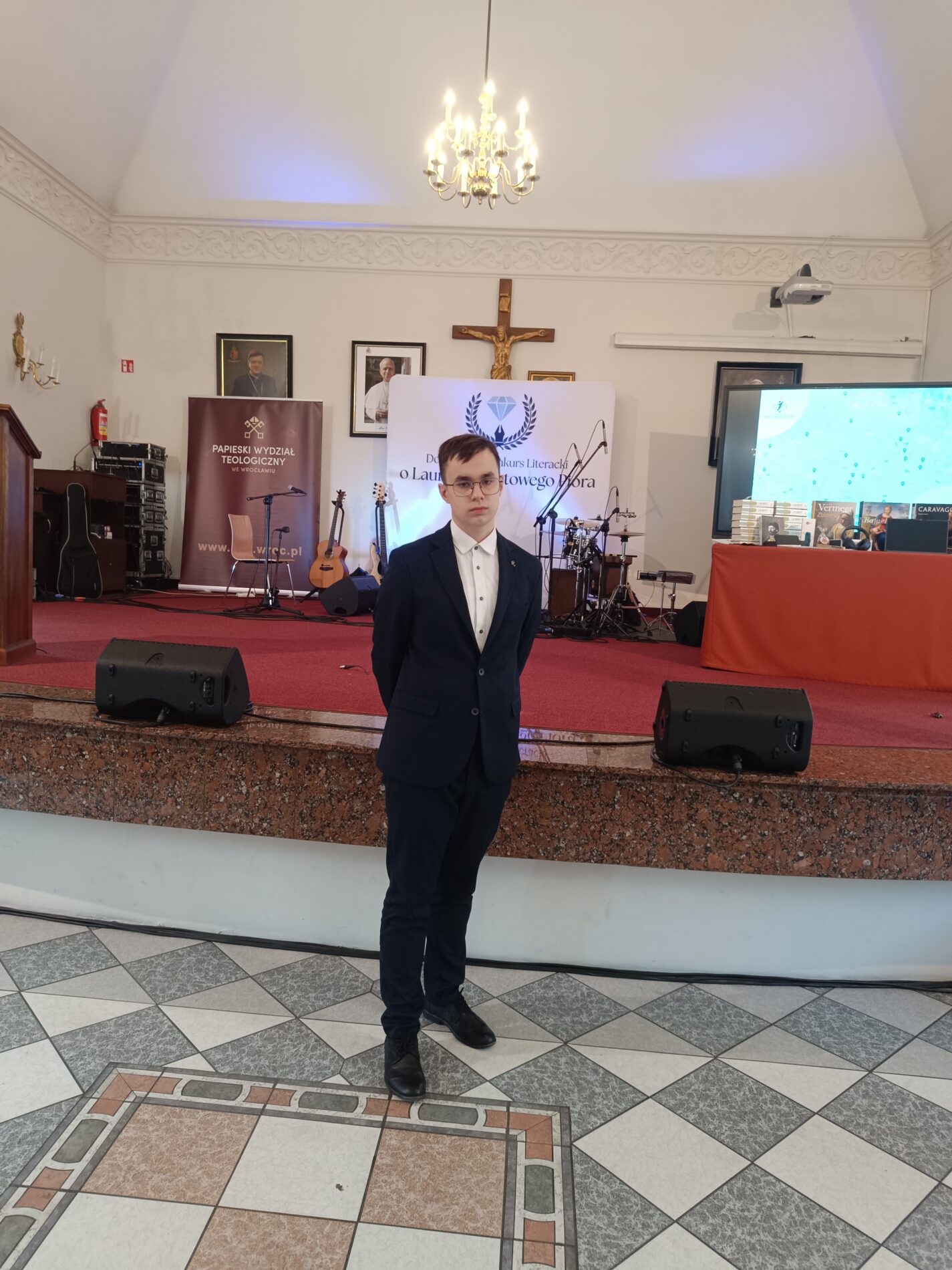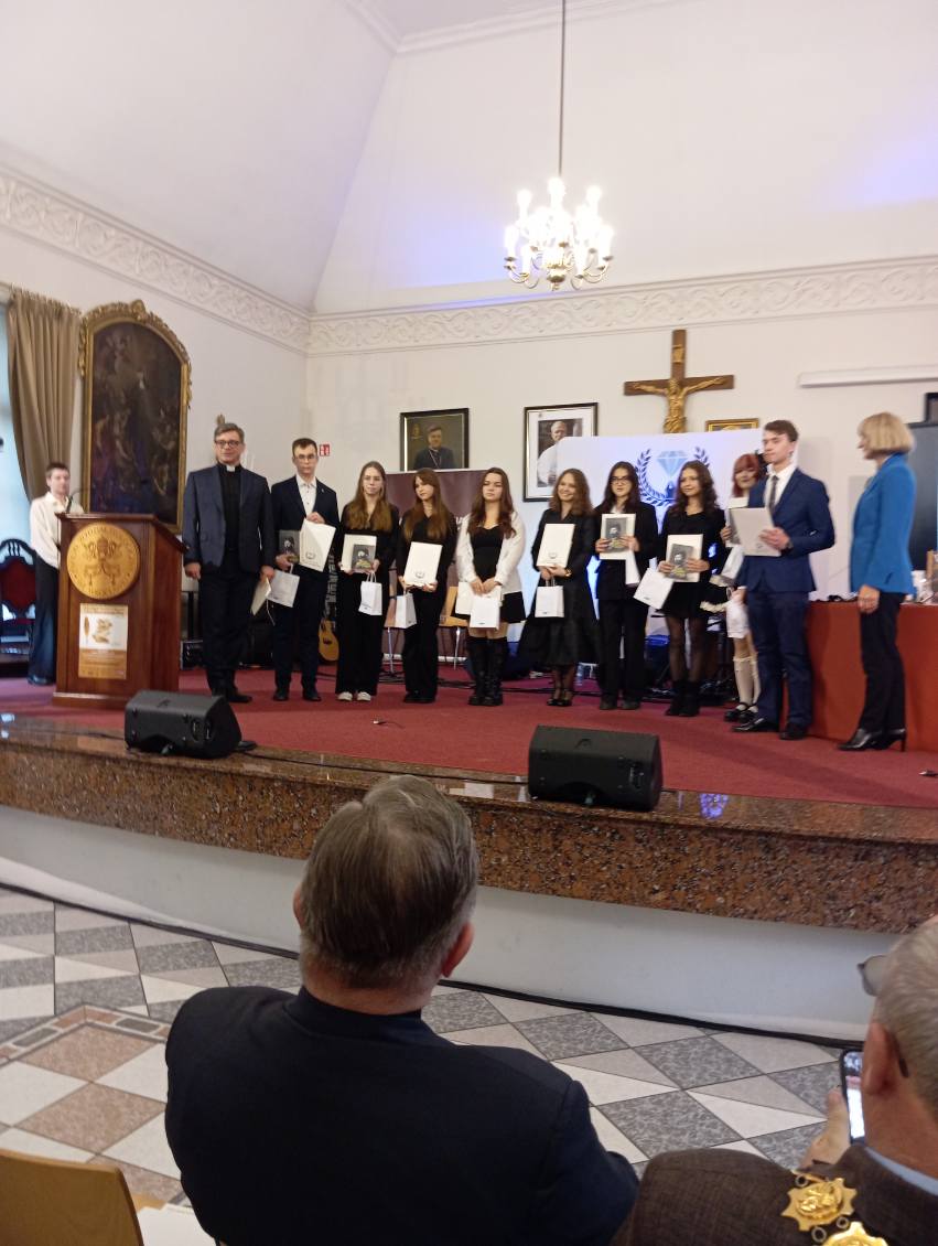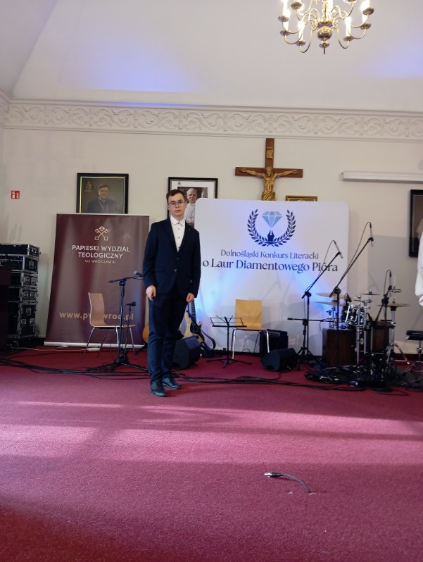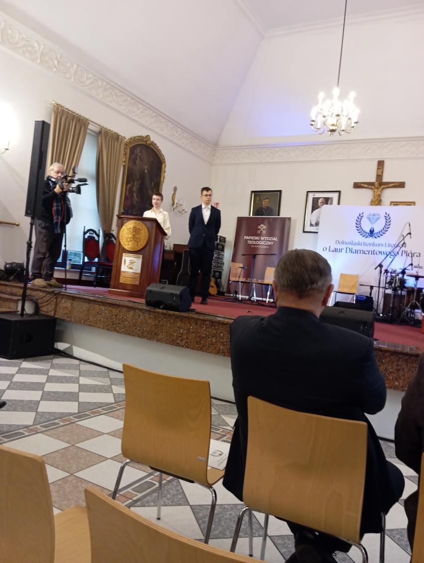 Dolnośląski Konkurs Literacki o Laur Diamentowego Pióra rozstrzygnięty. Podczas uroczystej Gali Finalistów, która odbyła się 4 grudnia 2025r. w Auli Papieskiego Wydziału Teologicznego we Wrocławiu uczeń naszej szkoły Jakub Nowak z klasy 3i otrzymał wyróżnienie . O zwycięstwo rywalizowało 173 uczniów szkół średnich z całego Dolnego Śląska. W swoich tekstach mierzyli się z pytaniem o „jedenaste przykazanie” nawiązując do apelu Mariana Turskiego: ” Nie bądź obojętny”. Drugi z tematów dotyczył słów Wiktora Hugo o druku jako matce rewolucji. Do Finału dostało się 37 uczniów, a wśród nich nasz Jakub, Gratulujemy serdecznie i życzymy dalszych sukcesów w pracy literackiej.